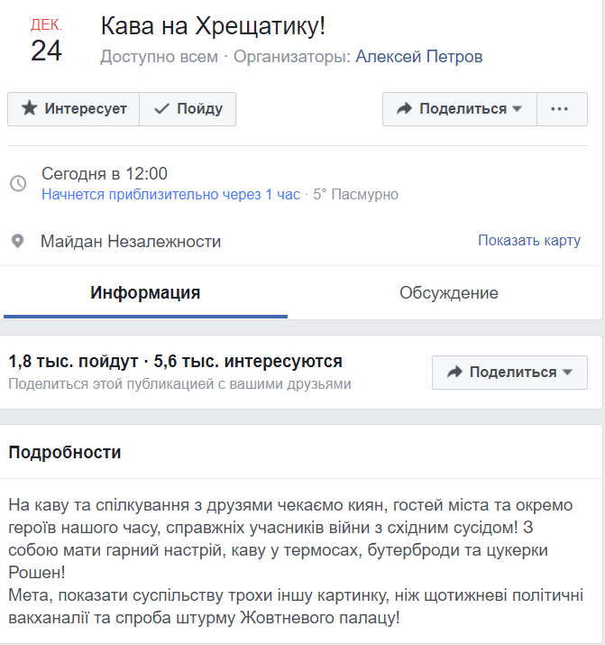 Сторонников Порошенко собирают через Facebook - там создано мероприятие "Кофе на Крещатике". Около двух тысяч пользователей подтвердили свое участие, еще пять с половиной тысяч заявили, что интересуются митингом. В то же время неизвестно, сколько народу явится на самом деле.