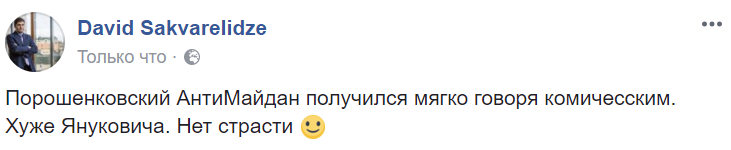 12:49 "Порошенковский АнтиМайдан получился мягко говоря комичесским. Хуже Януковича. Нет страсти", - оценил происходящее на Майдане сторонник Саакашвили Давид Сакварелидзе.