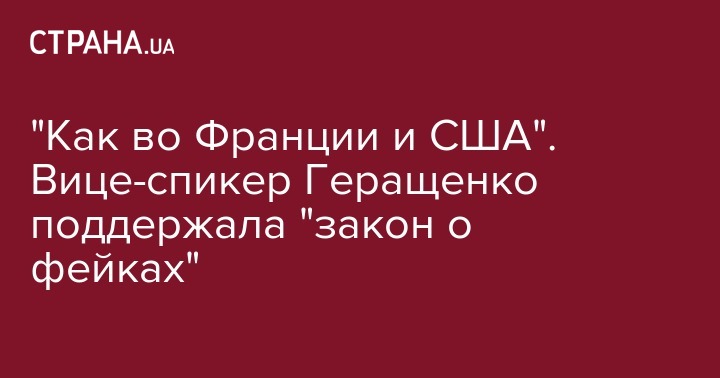 "Мы видим, что Франция, США, все остальные цивилизованные страны уже нарабатывают соответствующий законопроект про борьбу с фейками, против их распространения. Я считаю, что и парламент, и журналисты, и эксперты должны присоединиться к такой рабочей группе, наработать такой законопроект и принять его максимально быстро", - заявила Геращенко.