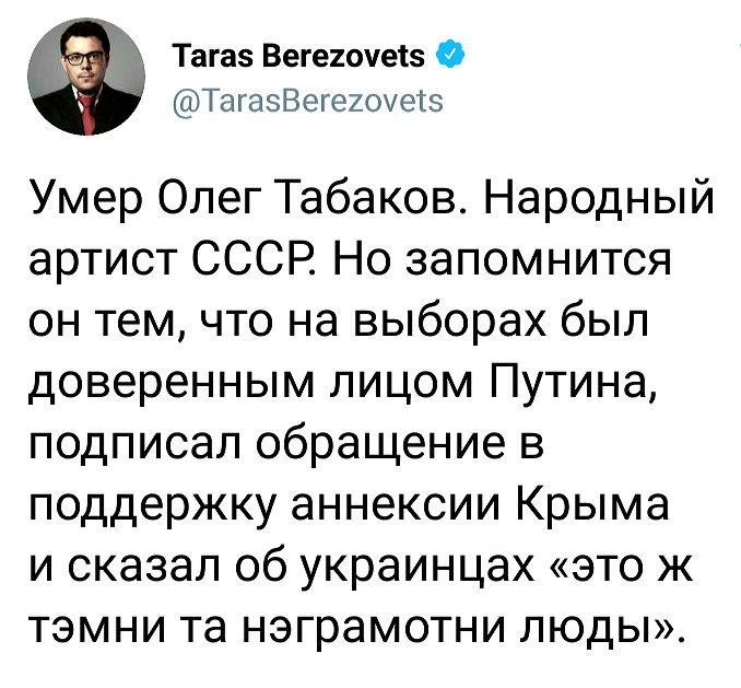 Политолог Тарас Березовец заявил, что Табаков запомнится лишь тем, что поддержвал Путина, аннексию Крыма и называл украинцев "неграмотными людьми".