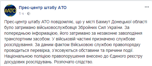 В Бахмуте Донецкой области задержали военного ВСУ, который похитил транспортное средство. Об этом сообщает штаб АТО в Facebook.