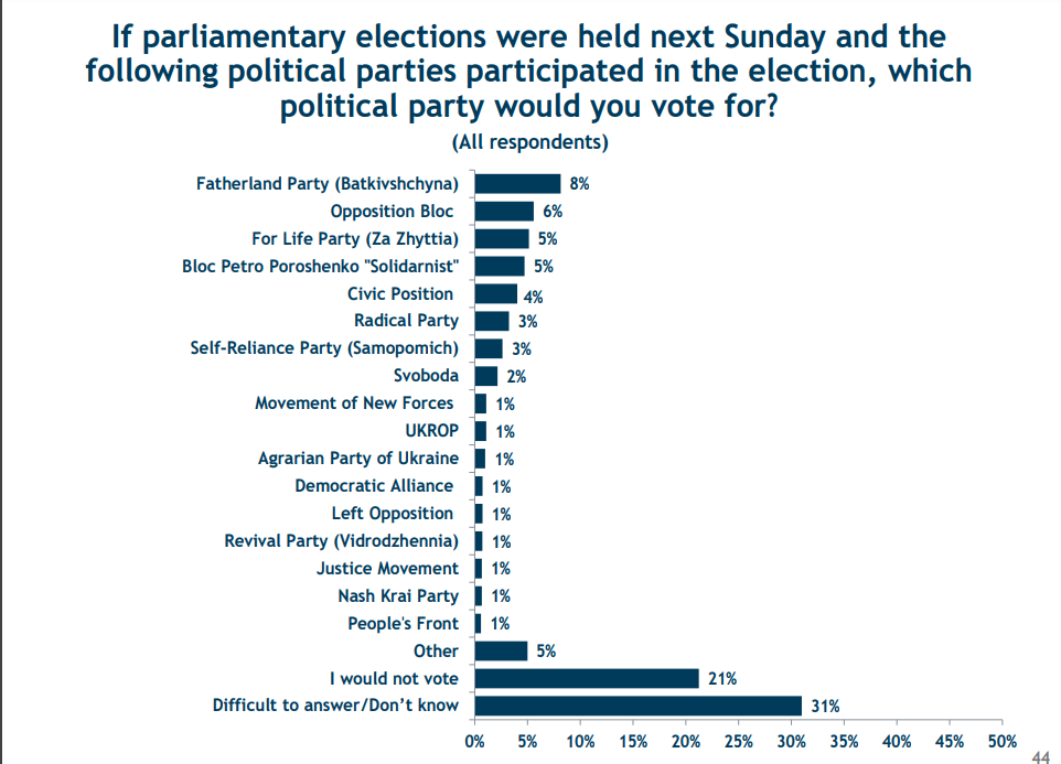 Рейтинг поддержки Порошенко, по данным этого исследования, продолжает снижаться и составил исторический минимум с марта 2014 года - 14%. Рейтинг БПП упал вообще до 5%.