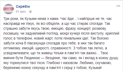 "Три года, как Кузьмы не с нами. Время идет... и хуже не то, что время на самом деле не лечит, как все обещали, а время стирает воспоминания. Так страшно забыть какую-то твою эмоцию, фразу, концерт, разговор, улыбку, или задумчивый взгляд, мокрые кудри после выступления, хриплый голос в телефоне, новая шутка, поток гениальных идей. Так страшно забыть хотя бы полсекунды воспоминаний о тебе, у них так много оптимизма, эмоций, искренности, подлинности. С тобой так легко, а осознавать, что ты живешь только в памяти так трудно... Твое умение быть Человеком - бесценно, так же, как и вклад в каждую душу, которую затронули твои песни. Глубоко и насовсем. Любим, скучаем, бережем каждую секунду в памяти и сердце с тобой, Кузьма", - говорится в сообщении.