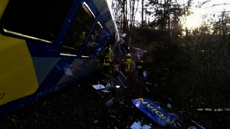 В Баварии утром во вторник, 9 февраля, на одноколейном участке трассы столкнулись два пассажирских состава, в результате аварии несколько вагонов сошли с рельсов.