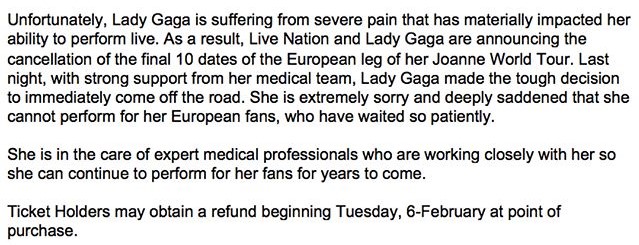 Американская певица Lady Gaga сообщила о прекращении своего европейского тура из-за обострения хронической фибромиалгии. Об этом артистка сообщила в своем Instagram.