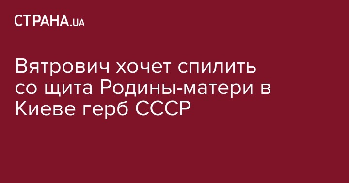 Глава Института Национальной памяти Владимир Вятрович считает, что герб Советского Союза на щите монумента Родина-мать в Киеве противоречит закону о декоммунизации и его необходимо удалить. Об этом Вятрович сообщил в эфире телеканала "Прямой".