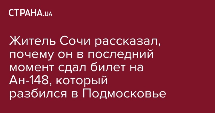 Житель Сочи Максим Коломейцев, который собирался лететь из Москвы в Орск на разбившемся в Подмосковье самолете Ан-148, за несколько дней до рейса неожиданно передумал лететь этим рейсом и сдал билеты.