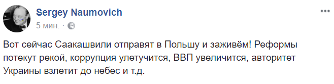 16:16  "Вот сейчас Саакашвили отправят в Польшу и заживём! Реформы потекут рекой, коррупция улетучится, ВВП увеличится, авторитет Украины взлетит до небес и т.д.", - иронизирует блогер Сергей Наумович.