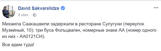 15:12  "Михаила Саакашвили задержали в ресторане Сулугуни (переулок Музейный, 10): три буса Фольцваген, номерные знаки АА (номер одного из них - АА0121СН).
