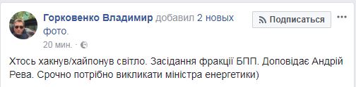 "Заседание фракции БПП. Докладывает Андрей Рева. Срочно нужно вызвать министра энергетики", - написал он на своей странице в Facebook, выложив фото.