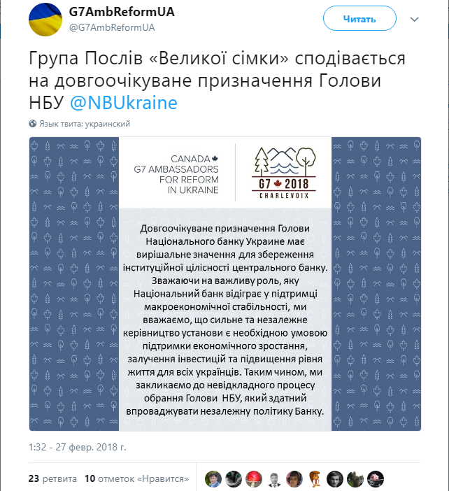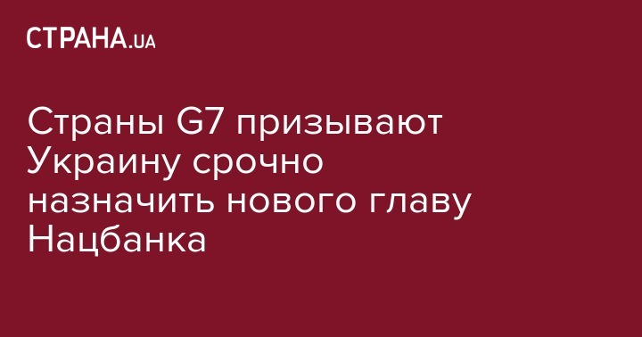 Послы "Большей семерки" (G7) призвали безотлагательно назначить нового главу Национального банка Украины. Заявление размещено на странице G7 в Twitter.