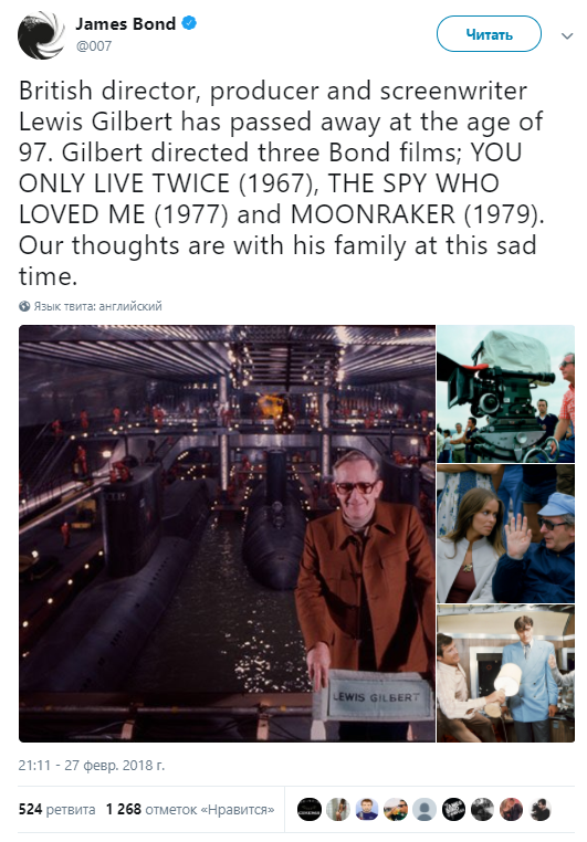В Монако в возрасте 97 лет скончался известный британский кинорежиссер Льюис Гилберт, снявший три фильма про Джеймса Бонда. Об этом сообщается на официальной странице франшизы в Twitter.