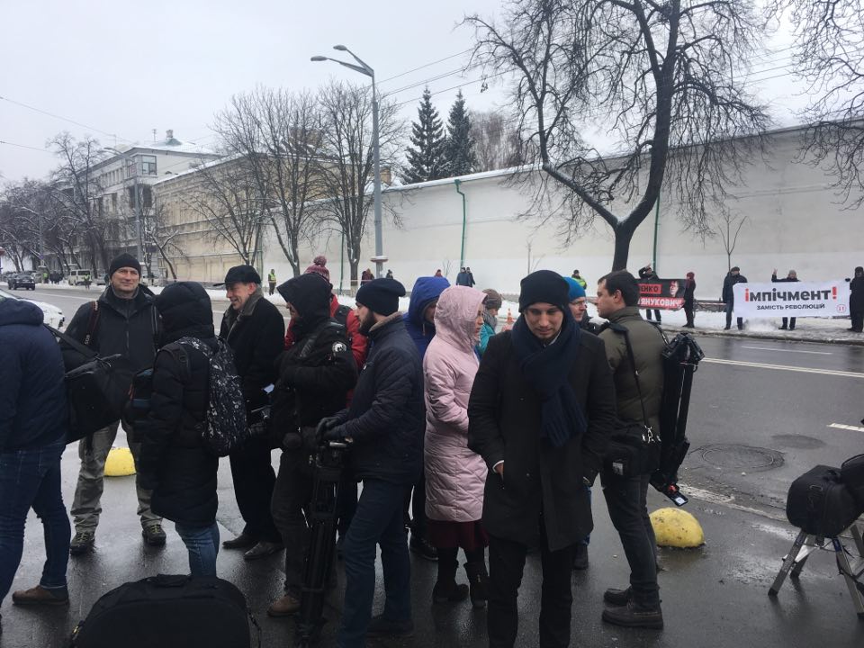 Помимо журналистов на улице Лаврской собрались люди с плакатами "Poroshenko is not my president", "Порошенко -вор", "Импичмент" и другими.
