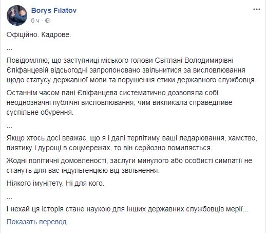 "В последнее время госпожа Епифанцева систематически позволяла себе неоднозначные публичные высказывания, чем вызвала справедливое общественное возмущение", — написал Филатов в Facebook.