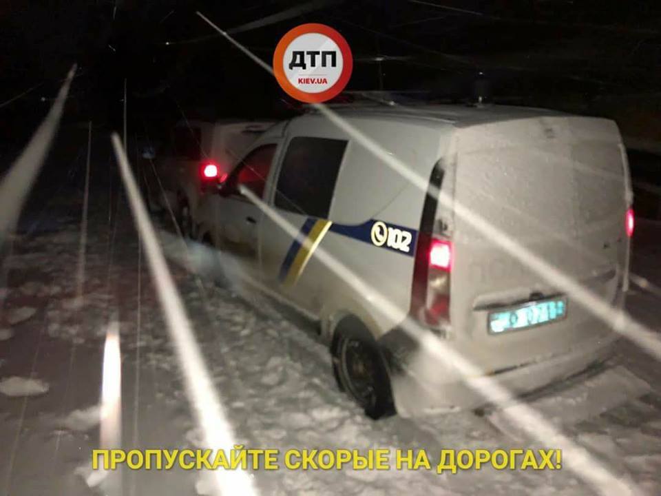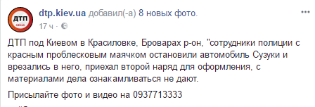 "ДТП под Киевом в Красиловке, Броварах р-он, сотрудники полиции с красным проблесковым маячком остановили автомобиль Suzuki и врезались в него, приехал второй наряд для оформления, с материалами дела знакомиться не дают", - говорится в сообщении.