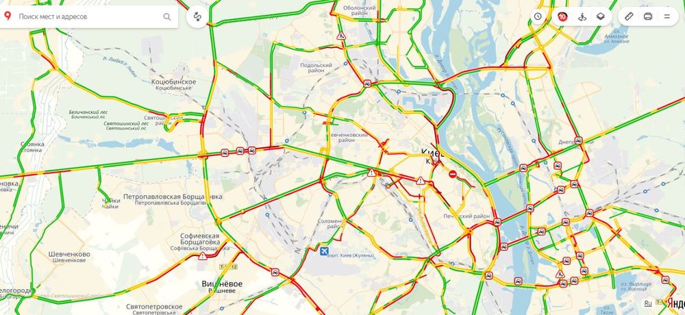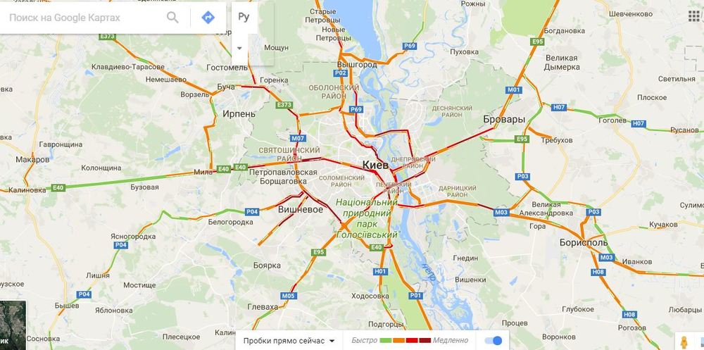 По данным Google maps и сервиса "Яндекс-пробки", парализовано движение транспорта на главных улицах города: проспекте Победы, бульваре Шевченко в обоих направлениях, бульваре Леси Украинки. Стоят автомобили в тянучке на Петропавловской Борщаговке и Также стоит движение на Северном и Южном мосту. На левом берегу Киева уже ставшие традиционными пробки на Воскресенке и Троещине.