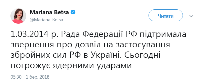 "1.03.2014 г. Совет Федерации РФ поддержал обращение о разрешении на применение вооруженных сил РФ в Украине. Сегодня угрожает ядерными ударами", - написала Беца в Twitter.