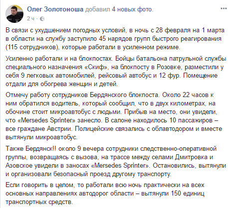 "Отмечу работу сотрудников Бердянского блокпоста. Около 22 часов к ним обратился водитель, который сообщил, что в двух километрах на обочине стоит микроавтобус с людьми. Прибыв на место, они увидели, что Mersedes Sprinter занесло. В салоне находились 10 пассажиров – все граждане Австрии. Полицейские связались с облавтодором и вместе вытянули микроавтобус", - сообщил Золотоноша.