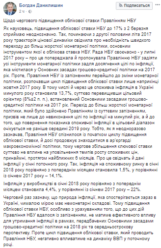 "Начиная со второй половины лета 2017 траектория ценовой динамики свидетельствовала о необходимости скорейшего перехода к более жесткой монетарной политики, основным инструментом которой является учетная ставка НБУ. Совет НБУ об этом предупреждал и предлагал правлению НБУ задействовать все инструменты монетарной политики ... Однако, правление НБУ с опозданием перешло к изменению монетарной политики, начав цикл повышения учетной ставки лишь в конце октября 2017 года ", - отметил Данилишин.