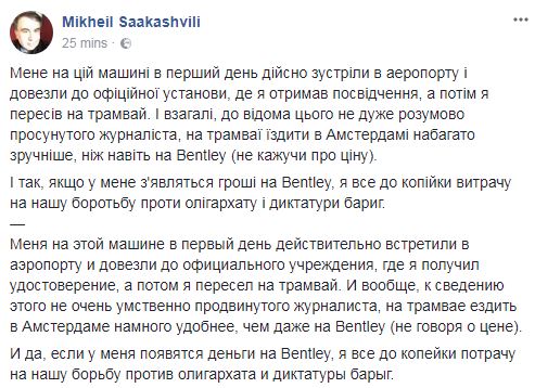 "Меня на этой машине в первый день действительно встретили в аэропорту и довезли до официального учреждения, где я получил удостоверение, а потом я пересел на трамвай. И вообще, к сведению этого не очень умственно продвинутого журналиста, на трамвае ездить в Амстердаме намного удобнее, чем даже на Bentley (не говоря о цене)", - написал грузинский политик.