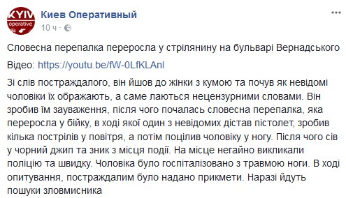 В ночь на субботу, 3 марта, в Киеве по бульвару Вернадского произошла стрельба. Мужчина получил огнестрельное ранение в ногу после словесной перепалки. Об этом сообщает портал Киев Оперативный на своей странице в Facebook.