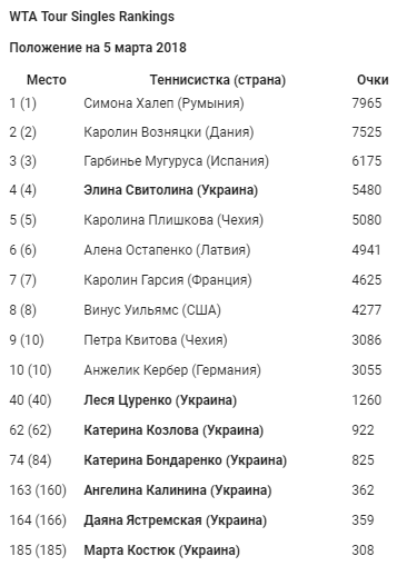 Украинская теннисистка Элина Свитолина осталась на четвертом месте в обновленном рейтинге WTA от 5 марта 2018 года.