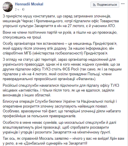 "С сожалением должен констатировать, что среди задержанных преступников, жителей Черкасс и Кропивницкого, которые подожгли офис Общества венгерской культуры Закарпатья в ночь на 27 февраля, есть и участники АТО", - написал Москаль.