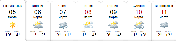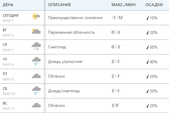 Сайт Gismeteо также прогнозирует прогнозирует небольшой минус в начале недели и потепление с 7 марта до +1...+4. Осадки ожидаются во все дни, кроме понедельника и воскресенья.