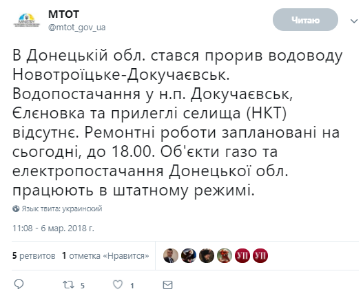 "Водоснабжение в населенных пунктах - Докучаевскн, Еленовки и близлежащих поселках отсутствует. Ремонтные работы запланированы на сегодня, 18:00", - сообщают в министерстве.