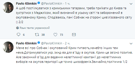 "Меня все о Собчак и оккупированный Крым спрашивают, как будто других тем нет. Придерживаться украинского законодательства для въезда в оккупированных Крым - это, конечно, позитив. Но законный въезд для ведения нелегитимной кампании в нелегитимных выборах на оккупированной территории - это точно шизофрения. Конечно, политическая", - написал Климкин.