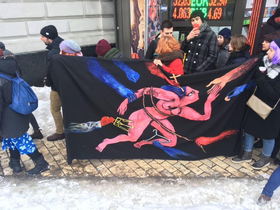 На площади у КГГА полиция забрала у активистов плакат, символизирующий борьбу украинских женщин за равные права. Копы не объяснили причины конфискации, но, вероятно, это связано с гербом Украины на плакате.