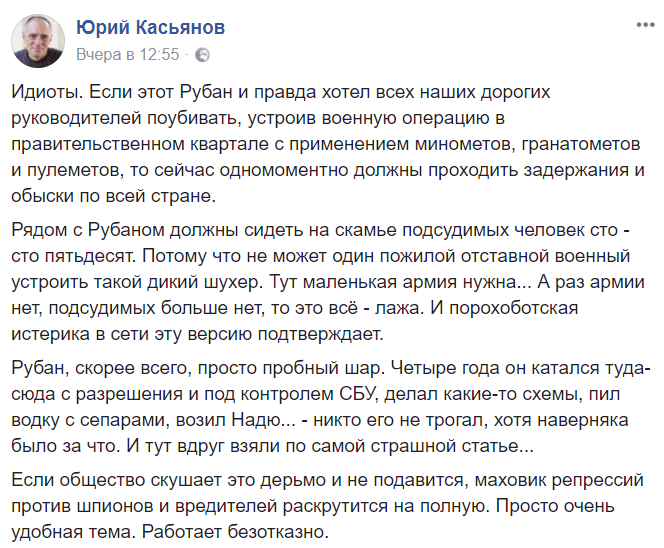 "Идиоты. Если этот Рубан и правда хотел всех наших дорогих руководителей поубивать, устроив военную операцию в правительственном квартале с применением минометов, гранатометов и пулеметов, то сейчас одномоментно должны проходить задержания и обыски по всей стране.