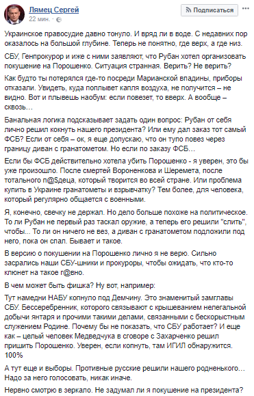 В версию о покушении на Порошенко лично я не верю. Сильно засрались наши эсбэушники и прокуроры, чтобы ожидать, что кто-то клюнет на такое г@вно", – пишет Лямец.