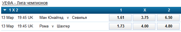 Котировки на сегодняшние ответные матчи 1/8 ЛЧ от британской William hill