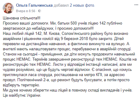 В Соломенском районе Киева закрывают лицей № 142 по улице Политехнической, 2в. Об этом сообщила одна из родителей ученика Ольга Гальчинская на своей странице в Facebook.