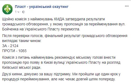 Комиссия по наименованиям Киевской городской госадминистрации утвердила результаты общественного обсуждения, на котором приняли предложение переименовать улицу Бойченко на улицу Украинского Пласта.