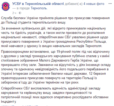 СБУ принудительно выдворила из Украины гражданина Республики Польша, студента одного из высших учебных заведений Тернополя, за публичное надругательство над государственными символами Украины. Об этом сообщает пресс-служба СБУ в Facebook.