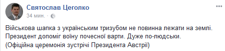 Пресс-секретарь президента Святослав Цеголко рассказал, что Петр Порошенко поднял шапку воина почетного караула, упавшую во время официальной встречи с президентом Австрии Ван дер Белленом.