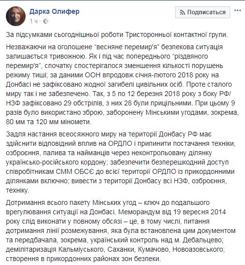 Об этом по итогам переговоров в Минске 14 марта сообщила пресс-секретарь второго президента Украины, представителя страны в ТКГ Леонида Кучмы Дарья Олифер на своей странице в Facebook.