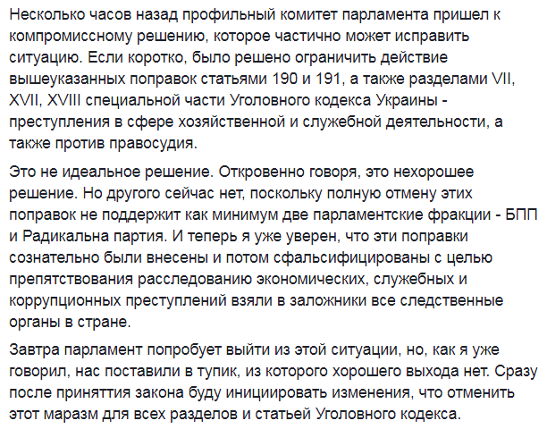 "Несколько часов назад профильный комитет парламента пришел к компромиссному решению, которое частично может исправить ситуацию. Если коротко, было решено ограничить действие вышеуказанных правок статьями 190 и 191, а также разделами VII, XVII, XVIII специальной части Уголовного кодекса Украины - преступления в сфере хозяйственной и служебной деятельности, а также против правосудия", - рассказал он.