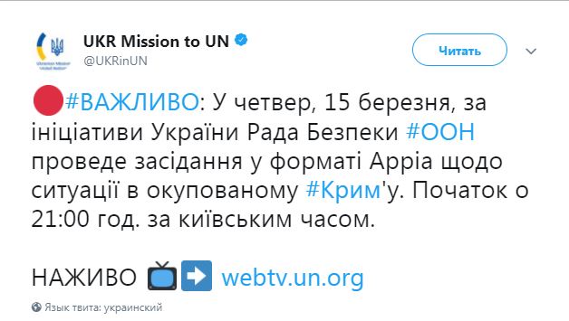 "В четверг по инициативе Украины Совбез ООН проведет заседание в формате Appia по ситуации в оккупированном Крыму. Начало в 21.00 по киевскому времени", - говорится в сообщении.