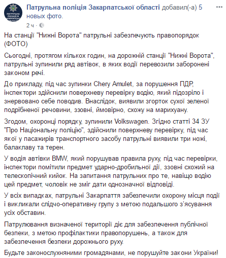 Сегодня, в течение нескольких часов, на дорожной станции "Нижние Ворота" в Закарпатье, патрульные остановили ряд машин, в которых водители перевозили запрещенные законом вещи. Об этом сообщает пресс-служба полиции в Закарпатской области.