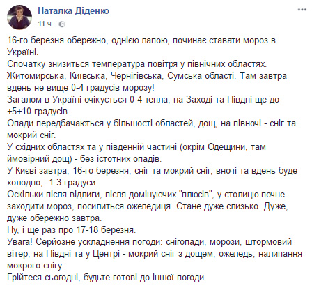 По прогнозу синоптика Наталки Диденко, 16 марта температура воздуха сначала снизится в северных областях - Житомирская, Киевская, Черниговская, Сумская области: "Там завтра днем не выше 0-4 градусов мороза!"