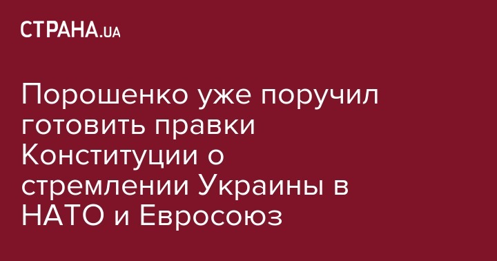 Президент Украины Петр Порошенко заявляет, что уже дал поручение подготовить проект поправок в Конституцию Украины, которые закрепят устремления Украины к членству в НАТО и Европейском Союзе, передает "Интерфакс- Украина".