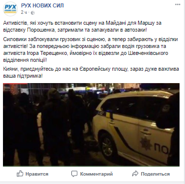 "Силовики заблокировали грузовик со сценой, а теперь забирают в отделы активистов! По предварительной информации, забрали водителя грузовика и активиста Игоря Терещенко, вероятно их отвезли в Шевченковское отделение полиции", - говорится в сообщении на странице партии.