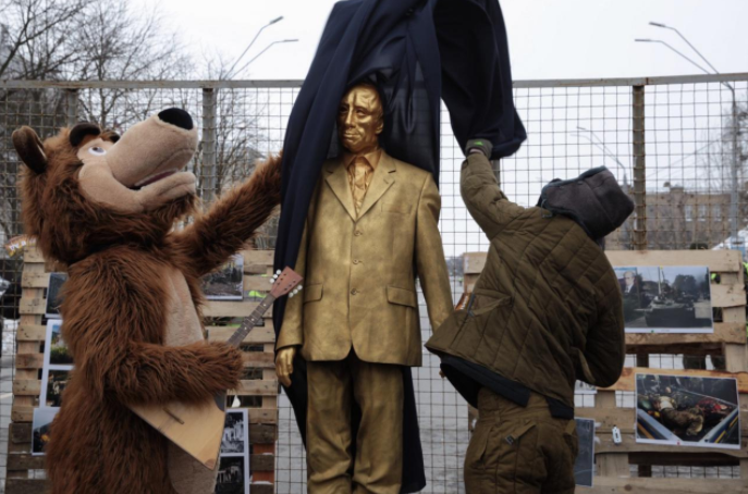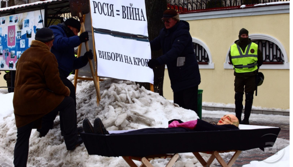 В день выборов президента России 18 марта, в Киеве националисты провели акцию, на которой медведь с балалайкой и "ватник" с бутылкой водки открыли памятник президенту России Владимиру Путину. В Харькове участники акции принесли гроб с куклой Путина. Во Львове здание дипведомства обнесли забором, а в Одессе играют немецкие военые марши.