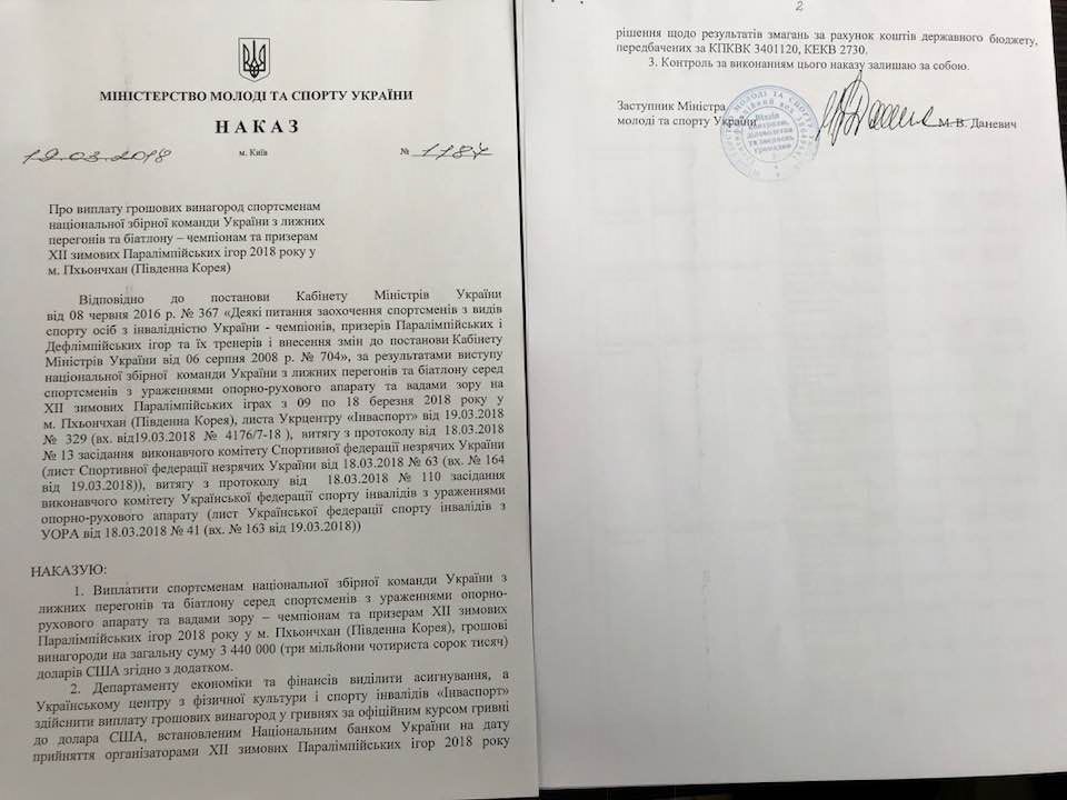 "Информируем общественность, что государство выплатит нашим чемпионам и призерам XII зимних Паралимпийских игр денежные вознаграждения на общую сумму более 90 млн гривен. Напоминаю, что наши паралимпийцы получат за I место - 125 тыс. долл.; за II место - 80 тыс. долл.; за III место - 55 тыс. долл.", - написал в соцсети Даневич.