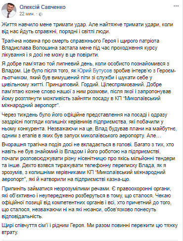 Искренние соболезнования семье и родным Героя. Мы вместе должны пережить эту тяжелую утрату", - написал Алексей Савченко на своей странице в Facebook.
