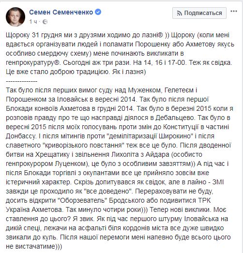 Семенченко отметил, что его вызывают в качестве свидетеля, но не сказал, по какому делу.