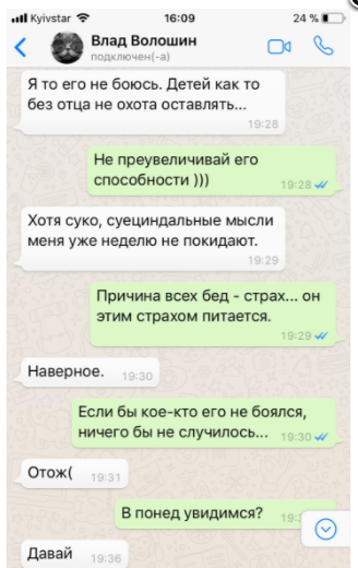 "Я его не боюсь. Детей как-то без отца не охота оставлять. Хотя, с..., суицидальные наклонности мысли меня уже неделю не покидают", – написал Волошин собеседнику 21 февраля.